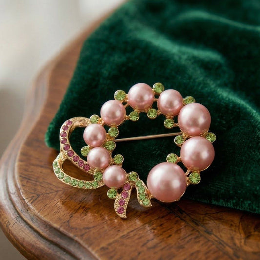Pearl Wreath and Rhinestone Ribbon Brooch